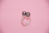 En ring i silver med två fantastiska, mörka Tahitipärlor. Noterna de små silverblommorna som håller pärlorna. Ringens yta är grov och ojämn och ger en perfekt kontrast till pärlornas skimrande lyster! Storlek 16,3.